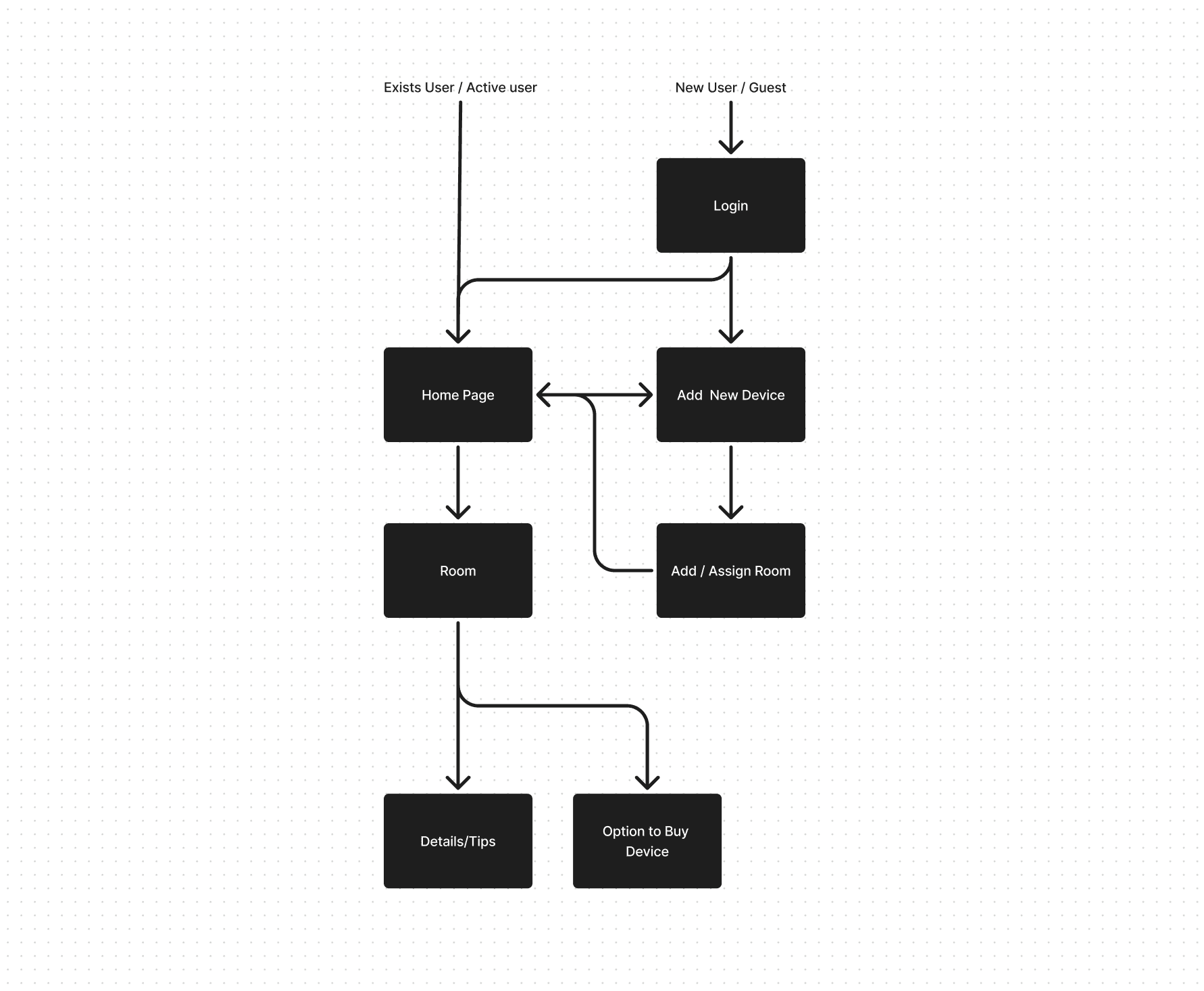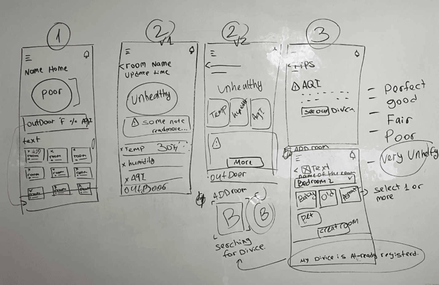 Next, I defined the user flow in greater detail to guide users effortlessly through the app. This step involved whiteboard sketches to explore different scenarios, ensuring all potential user actions were accounted for. My goal was to minimize friction points and optimize each interaction, from logging in to receiving personalized climate tips. I collaborated closely with stakeholders during this phase to confirm alignment on usability priorities and ensure that each flow would contribute to a smooth, engaging user experience.
