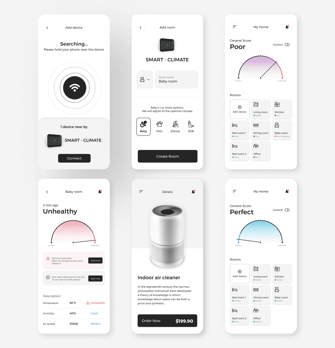 The Smart Climate app empowers users with real-time indoor climate insights and personalized recommendations to enhance air quality. By incorporating outdoor climate data, the app provides context-aware suggestions, such as opening windows when outdoor air quality surpasses indoor levels. Smart Climate also integrates product recommendations, offering items like humidifiers when indoor humidity is low, with direct purchase links for convenience. The app’s multi-device support allows users to manage climate settings seamlessly across different rooms, each of which can be customized with specific environmental parameters for precise control. This comprehensive approach ensures users can easily monitor and optimize their home climate based on real-time data and tailored guidance.